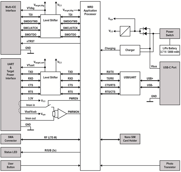 Das Blockdiagramm der WRD/Probe besitzt eine typische Gateway-Architektur: Die eine Seite ist in diesem Fall per SWD, JTAG bzw. UART mit einer Target-Baugruppe verbunden (siehe Multi-ICE Interface, UART & Target Power Interface). Die andere Gateway-Seite bildet eine LTE-M-Mobilfunkschnittstelle (siehe SMA Connector) bzw. Antenne. Dazu gehört auch der Nano SIM Card Holder für eine SIM-Karte, die für die Einwahl in ein Mobilfunknetz benötigt wird, um eine Remote-Verbindung zu einer Entwicklungsumgebung (IDE) aufzubauen. Darüber hinaus existiert noch eine UART-Verbindung am USB-C-Steckverbinder (USB-C Port), die allerdings für das Remote Debugging nicht benötigt wird.